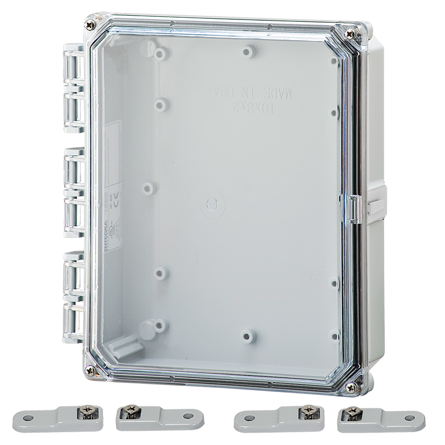 Clear replacement cover for 10" x 8" Premium Enclosure with standard hinge. Gasket installed and cover screw kit included.