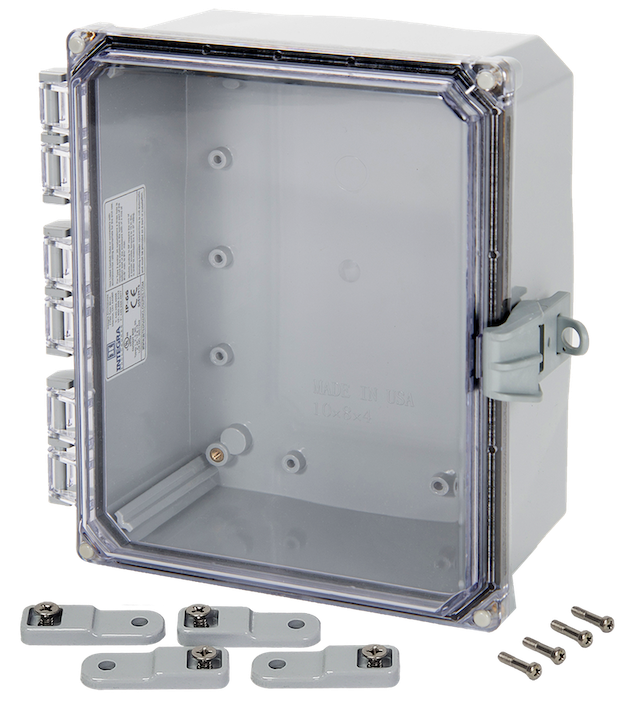 The H10084HCNL enclosure combines strength and clarity, crafted from high-impact polycarbonate and rated UL/cUL NEMA TYPE 4X and IP66 for exceptional environmental protection. Featuring a hinged clear cover, a non-metallic locking latch, and included mounting feet, this enclosure is both practical and user-friendly. Its internal dimensions of 8 x 10 x 4.58 inches provide ample space for mounting various components. With brass inserts for easy mounting and a hydro-phobic urethane gasket for sealing, this enclosure is ideal for applications requiring visibility and protection.
