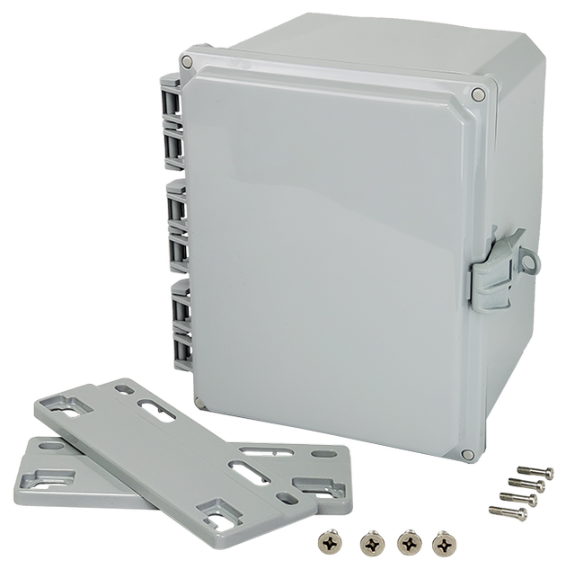 This Premium Line polycarbonate enclosure offers high durability with its opaque cover, hinged design, and non-metallic locking latch. It provides excellent protection with UL/cUL NEMA TYPE 4X and IP66 ratings, making it suitable for harsh environments. The light gray polycarbonate construction is UV-resistant, ensuring long-lasting performance. With brass inserts for easy mounting and a hydro-phobic urethane gasket, this enclosure is designed for versatile use. It measures 8 x 10 x 6.54 inches internally and comes with mounting flanges for secure installation, whether vertically or horizontally. The enclosure is ideal for a range of applications where secure, weatherproof protection is essential.