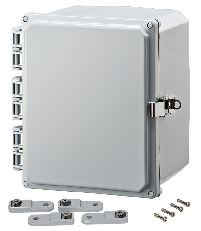The H10086HLL Premium Line polycarbonate enclosure combines strength and practicality with its hinged design, opaque cover, and stainless steel locking latch for added security. Featuring durable mounting feet and a light gray color with a gloss finish, this enclosure is crafted from high-impact, UV-resistant polycarbonate for reliable performance in demanding environments. Its UL/cUL NEMA Type 4X IP66 rating ensures robust protection against water, dust, and corrosion, making it ideal for a wide range of industrial and outdoor applications.