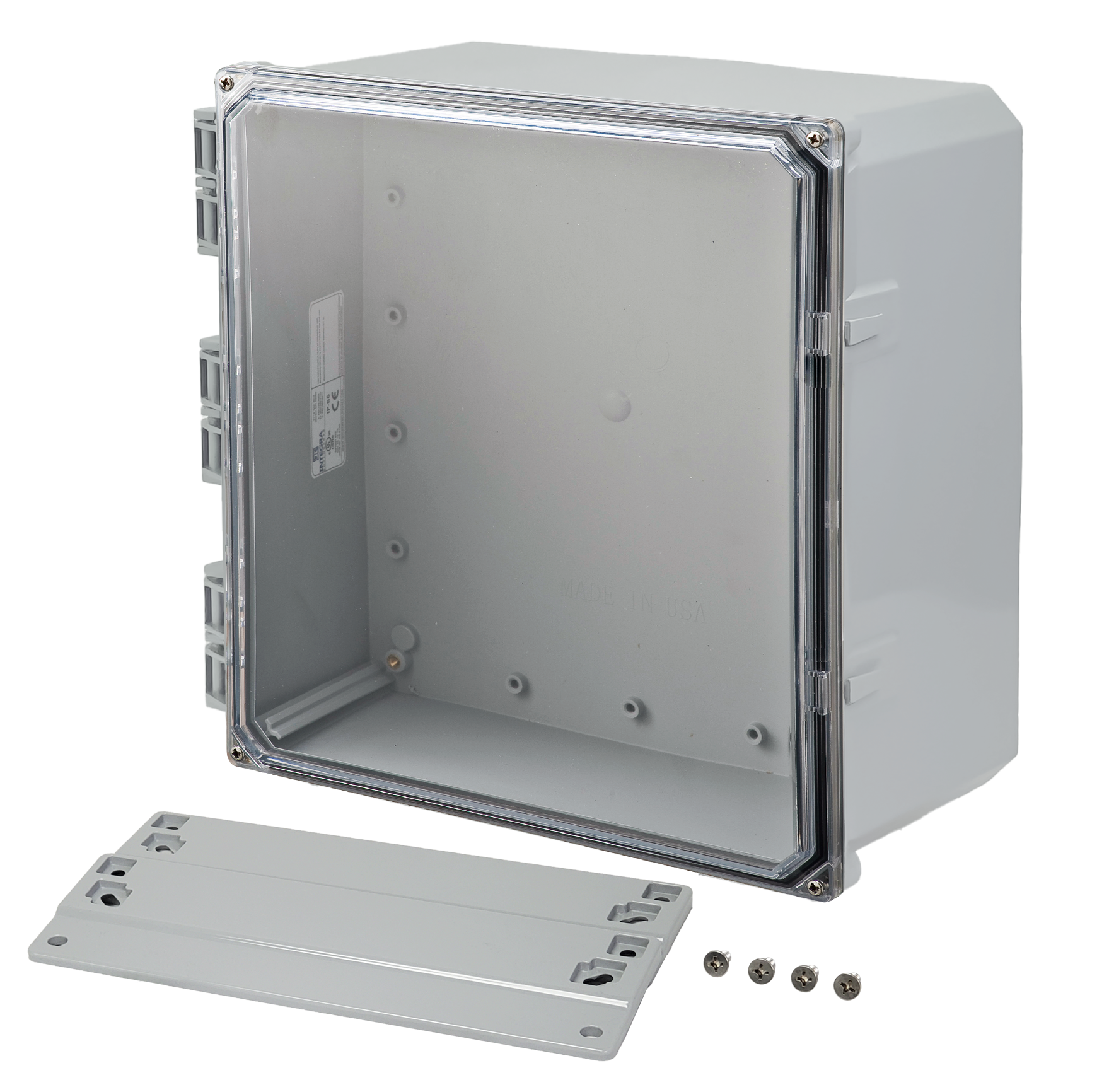 Clear replacement cover for 12" x 12" Premium Enclosure with standard hinge. Gasket installed and cover screw kit included.