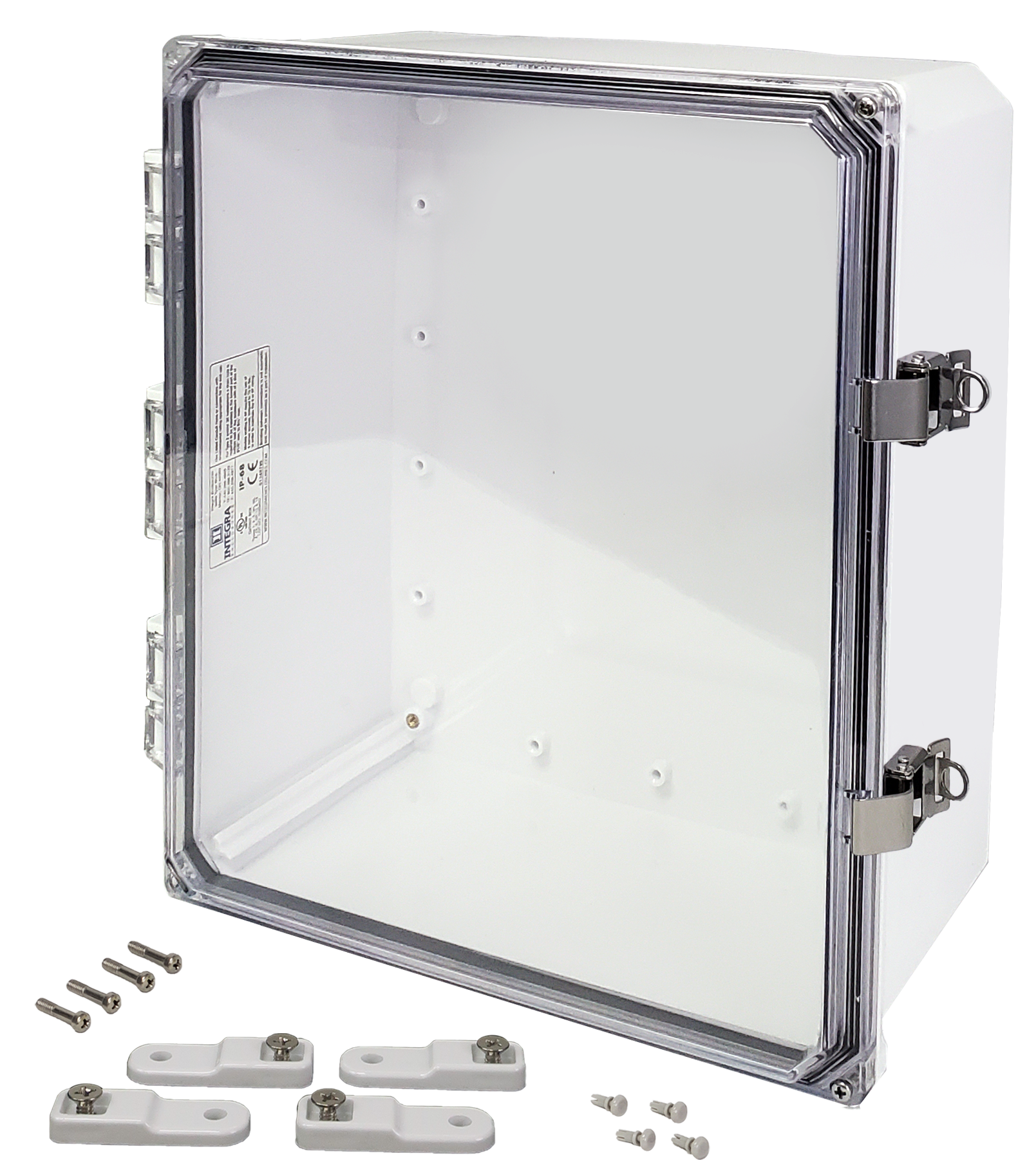 Clear replacement cover for 14" x 12" Premium Enclosure with standard hinge. Gasket installed and cover screw kit included.