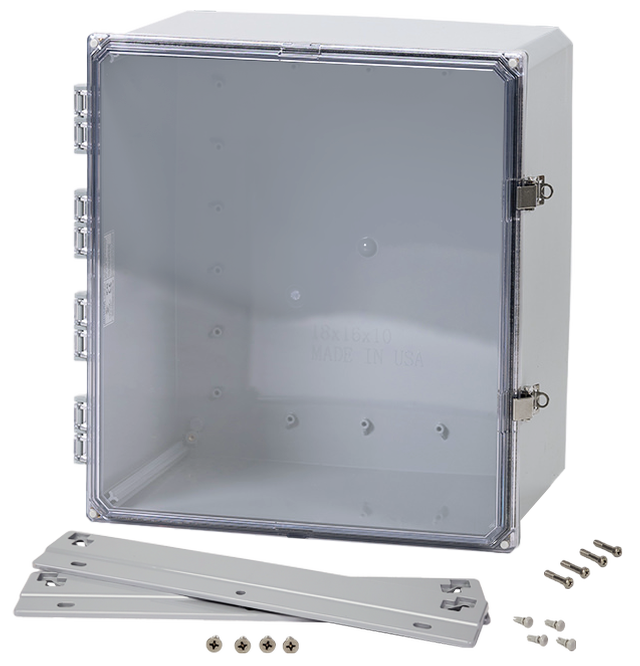 Clear replacement cover for 18" x 16" Premium Enclosure with standard hinge. Gasket installed and cover screw kit included.