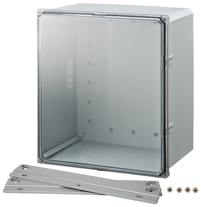 The H181610SCF polycarbonate enclosure offers superior protection with its UL/cUL NEMA Type 6P and IP68 ratings, making it ideal for demanding environments. Designed with a clear cover and screw closure, this premium enclosure features a durable light gray, high-impact UV-resistant polycarbonate construction. It includes brass inserts in the corner bosses for flexible internal mounting and a hydro-phobic urethane gasket to ensure a reliable seal. With internal dimensions of 16 x 18 x 10.36 inches and weighing 13.97 lbs, it’s a robust solution for safeguarding sensitive components. Four screws and mounting brackets are included for easy installation.