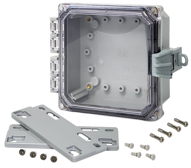 Clear replacement cover for 6" x 6" Premium Enclosure with standard hinge. Gasket installed and cover screw kit included.