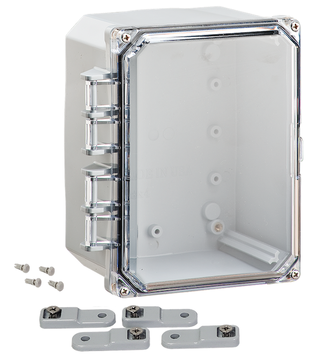 Clear replacement cover for 8" x 6" Premium Enclosure with standard hinge. Gasket installed and cover screw kit included.