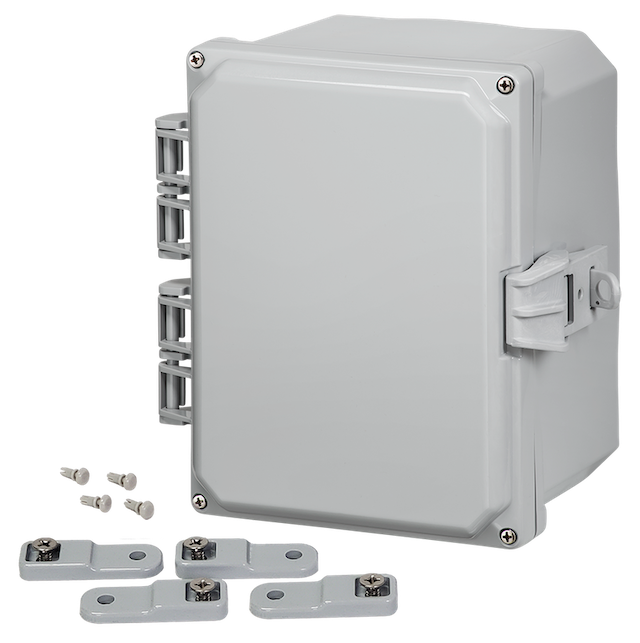 The H8064HNL Premium Line polycarbonate enclosure is designed with durability and security in mind, featuring a hinged opaque cover, non-metallic locking latch, and mounting feet. Constructed from high-impact, UV-resistant polycarbonate, this enclosure ensures long-lasting performance under demanding conditions. It is rated UL/cUL NEMA TYPE 4X and IP66, offering excellent protection against water and dust. The enclosure has external dimensions of approximately 8.16 x 9.69 x 5.30 inches, internal dimensions of 6 x 8 x 4.43 inches, and a wall thickness of 0.15 inches. It is light gray with a gloss surface, and includes brass inserts in the corner bosses for easy internal mounting. The enclosure also features a hydro-phobic urethane peel-and-stick gasket, providing a reliable seal for outdoor and industrial applications. The H8064HNL can function in temperatures ranging from -40 to 265F. It is UL-50/c-UL Listed, further emphasizing its suitability for rugged and diverse applications.